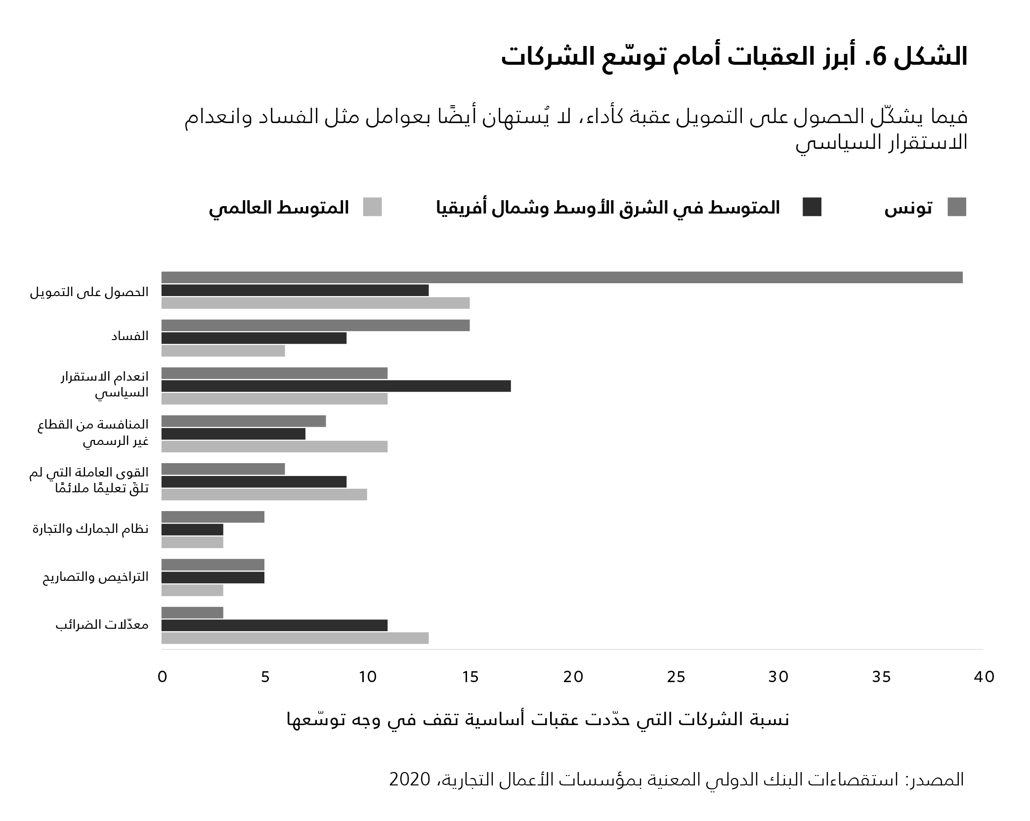 فاقم هبوط الاستثمارات تدهور أحوال القطاع الخاص، وهو الركيزة الأساسية لاستحداث فرص العمل وبالتالي لتأمين مصادر الدخل. وحدث ذلك نتيجة عوامل عدّة. فقد أسفر لجوء الحكومة إلى الاقتراض الداخلي عن مزاحمة تمويل القطاع الخاص على نحو متزايد. فبحلول أواخر تموز/يوليو 2023، لم يرتفع حجم تمويل النظام المصرفي المحلي للقطاع الخاص إلّا بنسبة 3.2 في المئة، وهي النسبة الأدنى المسجلة خلال السنوات الخمس عشرة الماضية على الأقل، ناهيك عن أنها أدنى بكثير من الزيادة المسجّلة في معدّلات الائتمان الممنوح للدولة والبالغة 21 في المئة. وفي منتصف العام 2023، انخفض إجمالي حجم الائتمان المقدّم إلى القطاع الخاص من مستوياته المسجلة قبل العام 2011 والبالغة 90 في المئة من الناتج المحلي الإجمالي، إلى 76 في المئة (انظر الشكل 5). وأكّدت استقصاءات البنك الدولي المعنية بمؤسسات الأعمال التجارية للعام 2020 أن الحصول على التمويل شكّل عقبة كأداء في وجه توسّع الشركات (انظر الشكل 6).