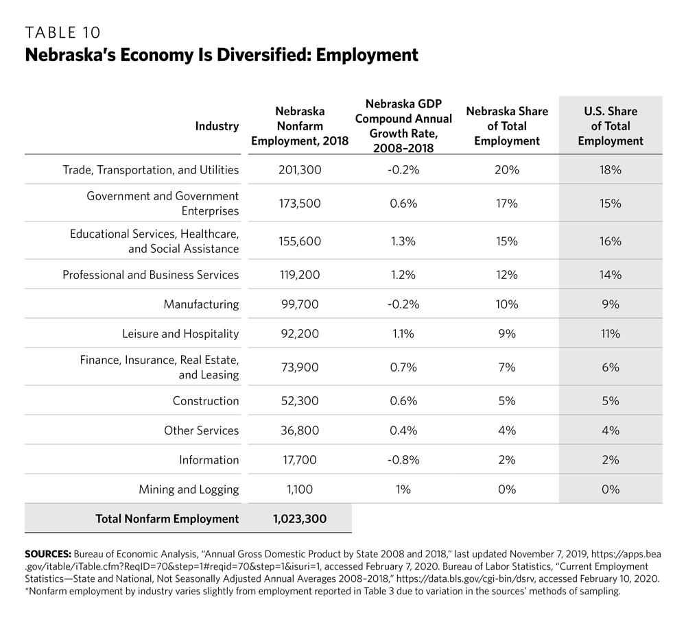 Nebraska’s economy is historically agricultural-based. While this tradition continues, its economy has become increasingly diversified. As shown in Tables 9 and 10, Nebraska’s service industries—including trade, transportation and utilities, and education and healthcare—contribute substantially to the state’s GDP and employment. Nebraska, however, lags behind the nation as a whole in terms of the share of its economy in several high-wage industries, such as information and the professional, scientific, and technical services component of the professional and business services industry.4