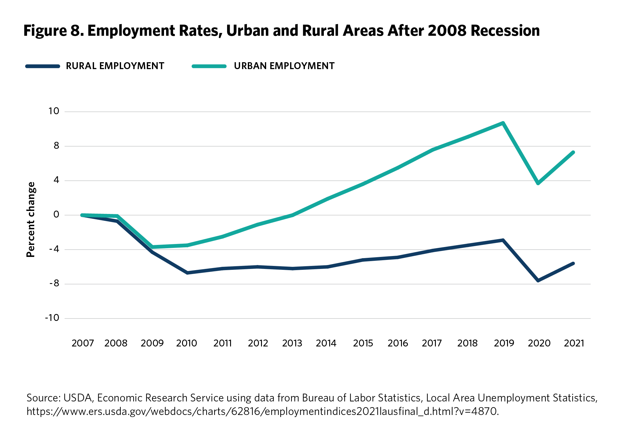 137 “U.S. Employment in Metro and Nonmetro Areas, 2007-21,” USDA, Economic Research Service, using data from the Department of Labor, Bureau of Labor Statistics, Local Area Unemployment Statistics Program, released April 15, 2022, https://www.ers.usda.gov/webdocs/charts/62816/employmentindices2021lausfinal_d.html?v=4870.